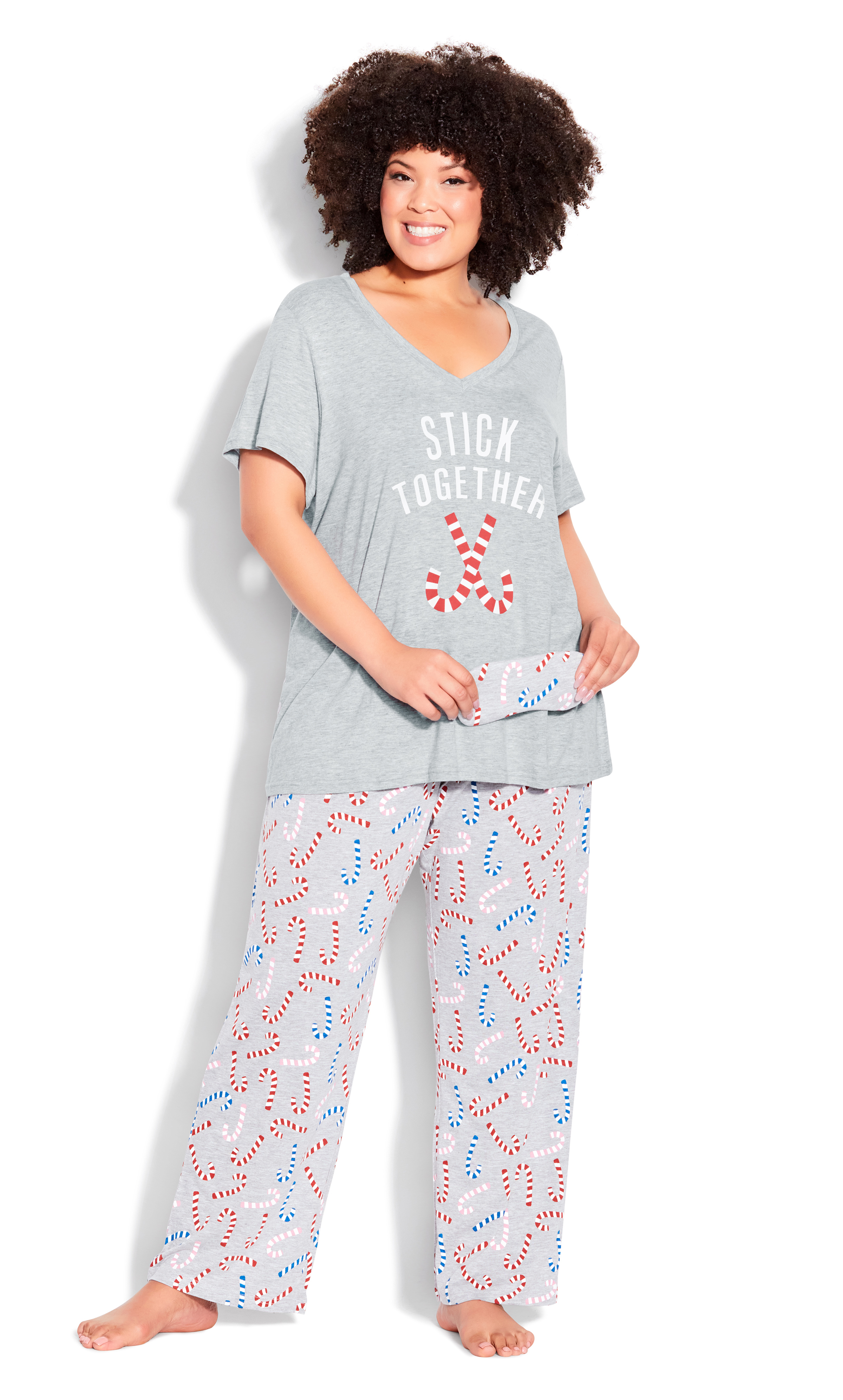 If you love a cute theme, you’ll love this Stick Together Sleep Set! The sweet candy-cane print is featured on the sleep pants as well as on the sleep top and mask for a coordinated finish to this set. The cozy gray hue is the ideal color for relaxed nights in with your loved ones during the holiday season. Since the full-length pants are balanced by a short-sleeved top you’ll also be comfortable all night long.