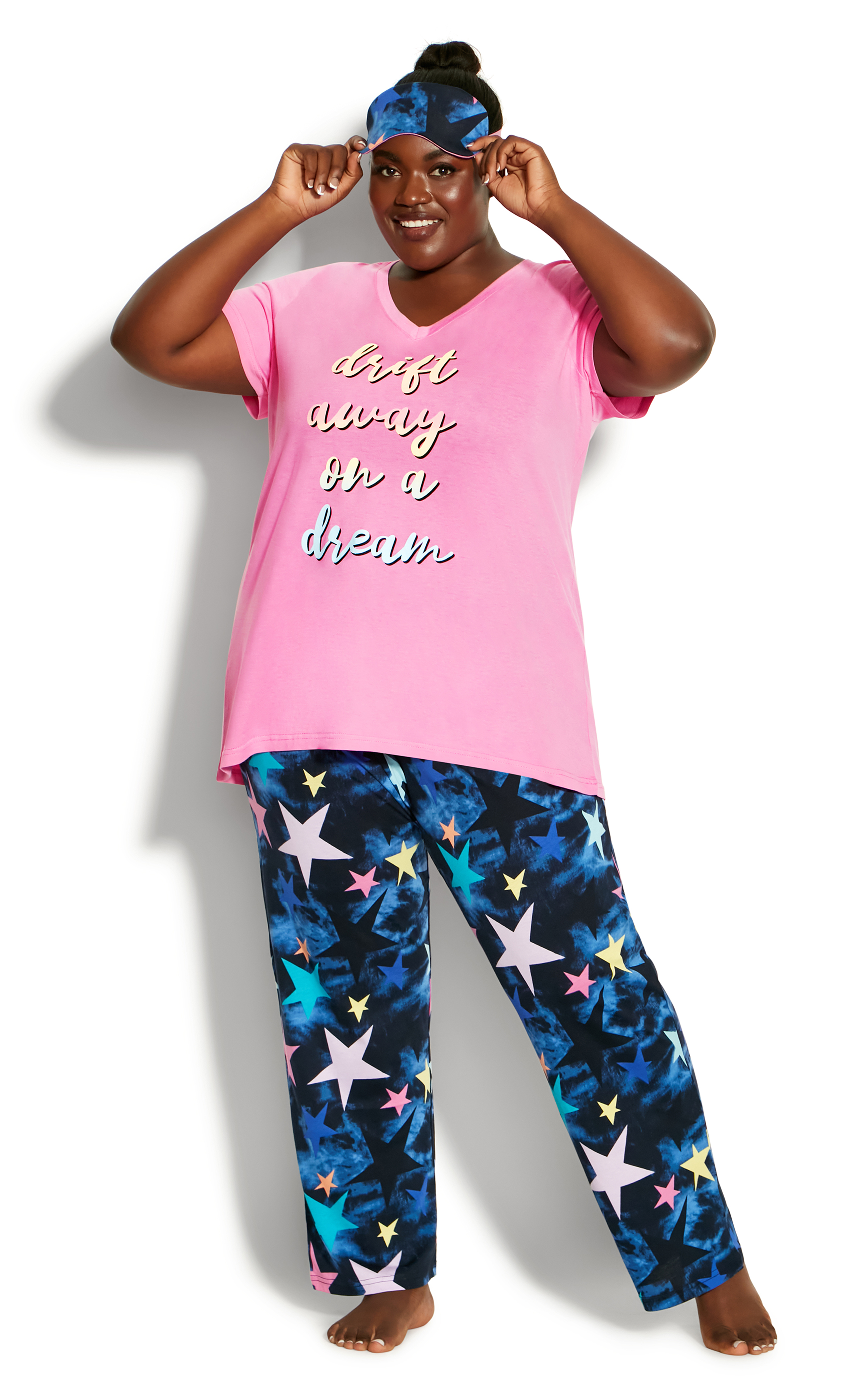 The best part about our Dream On Sleep Set is that it has everything you need for a great night of sleep. This coordinated set features a soft stretch sleep top, relaxed sleep pants, and the perfect finishing touch of a sleep mask. This set is perfect for gifting to a loved one or even to yourself, with its sweet ‘drift away on a dream’ slogan.